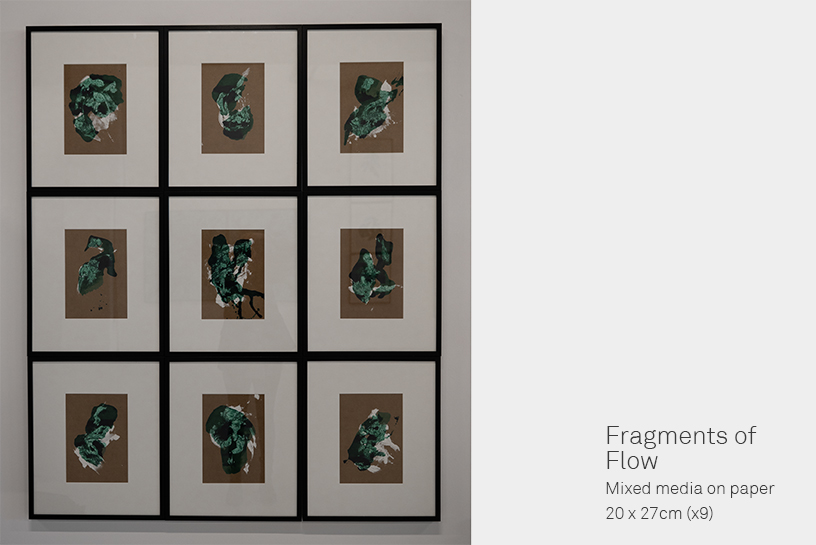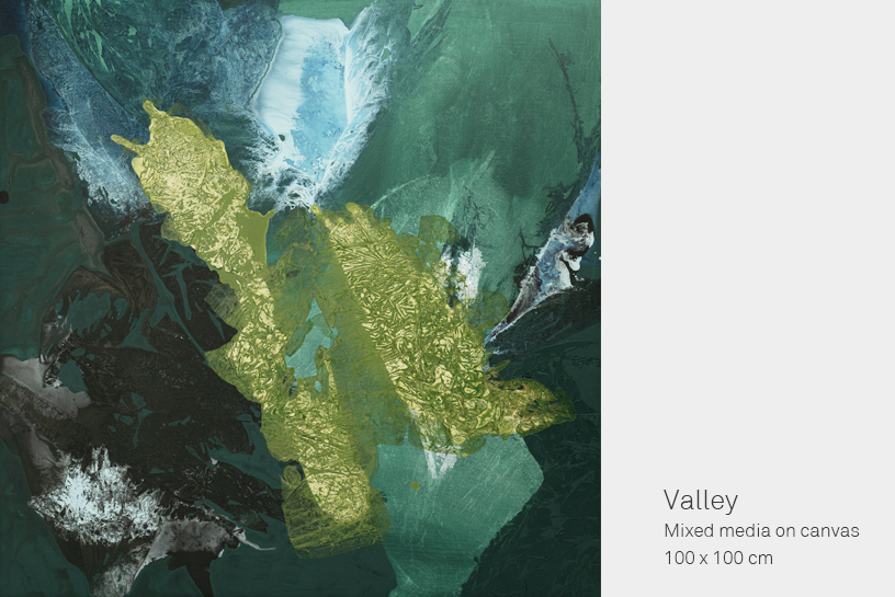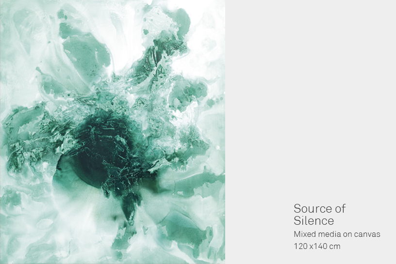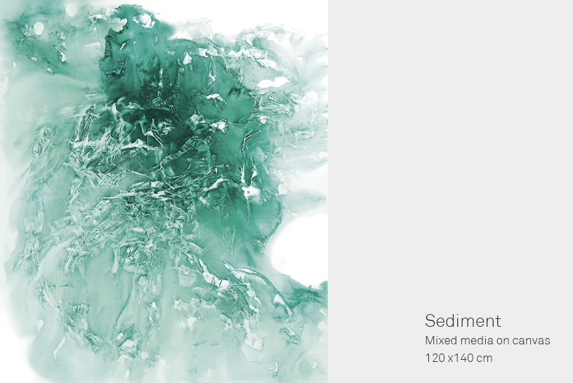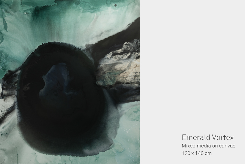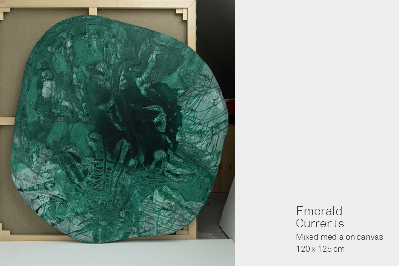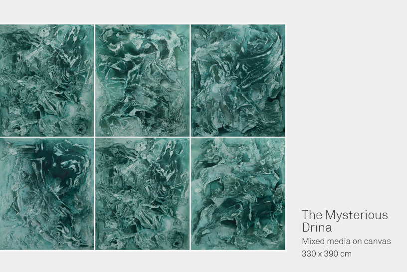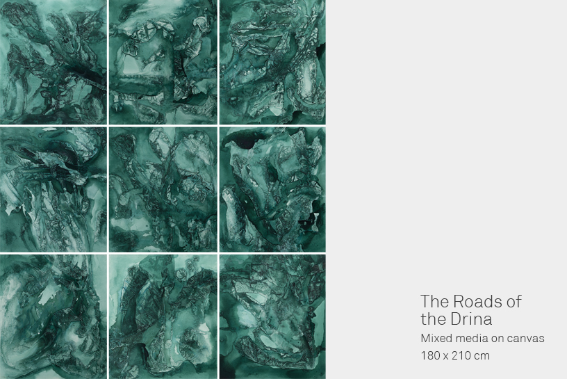 Although the symbolism of the color green is connected with the previous cycle of paintings in which she explored the natural properties of the emerald gemstone, the intensity here is different. It becomes a question of the nature of the movement of the earth and the water within it. The emerald green color originates from the meeting of chemical elements from distant places within the Earth’s crust, formed over time through tectonic movements. The Drina flows along the tectonic structure of high karst terrain, following a winding course remembered in the saying: “Who could ever straighten the crooked Drina?” Because of its green color, it was once called Zelenka. The paintings from the Flow series carry precisely that color and intensity.